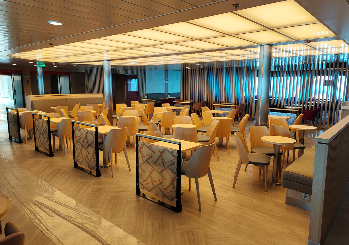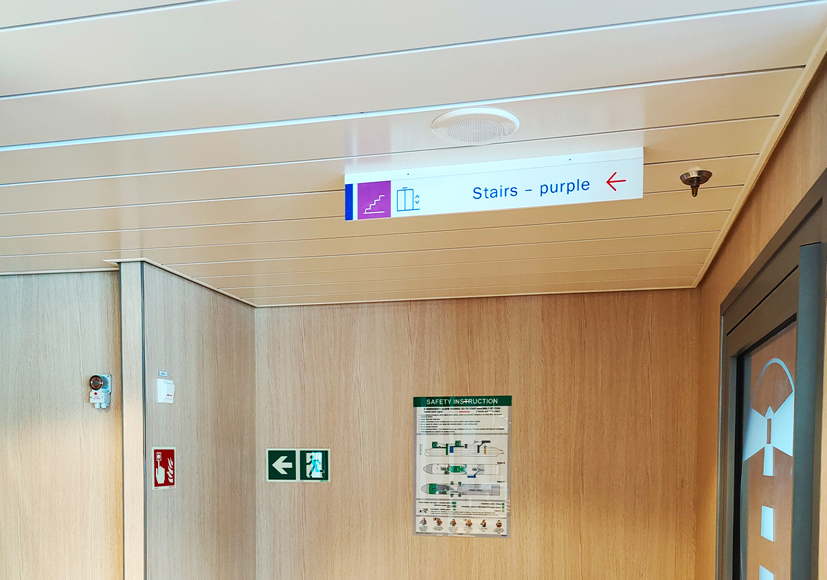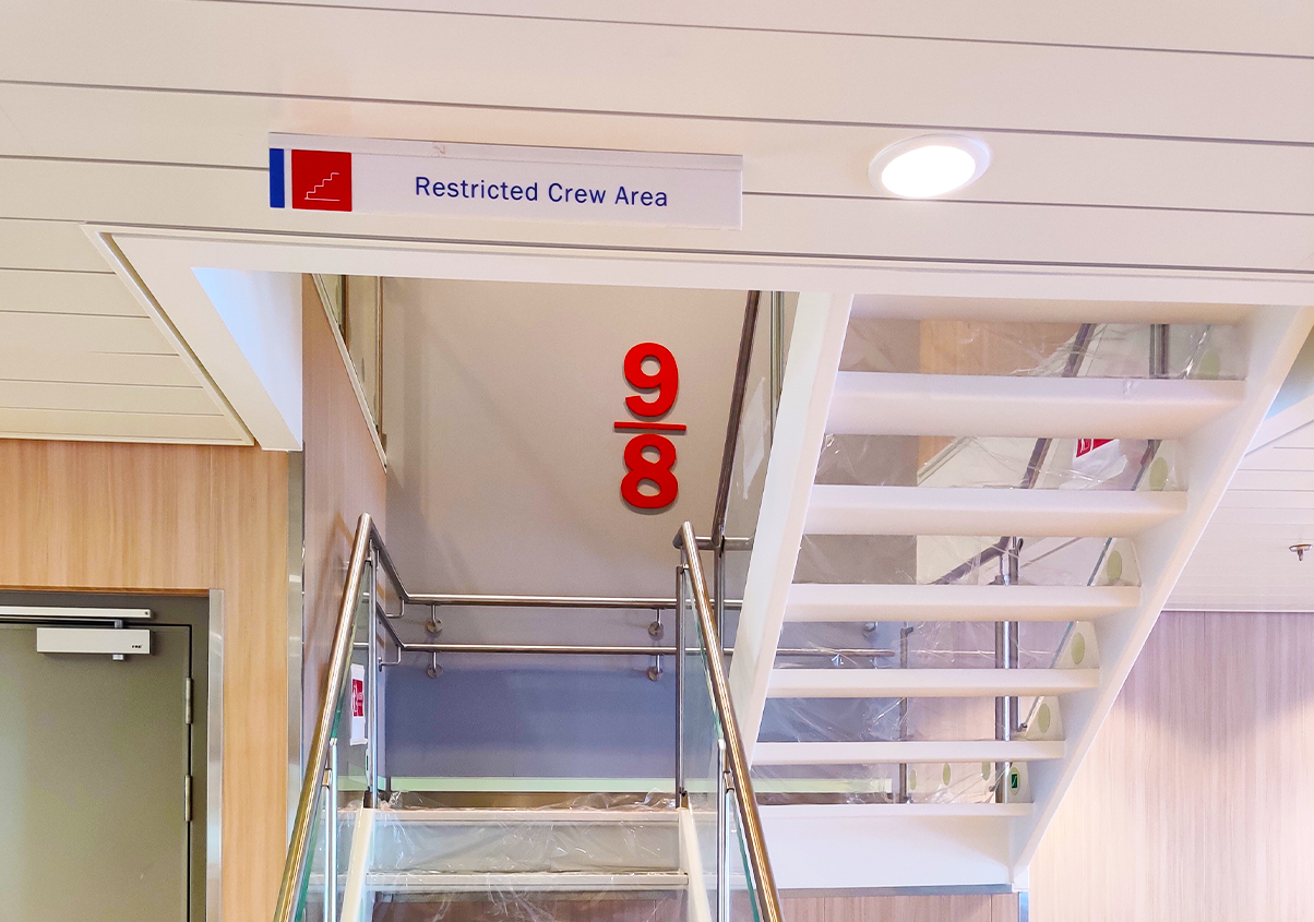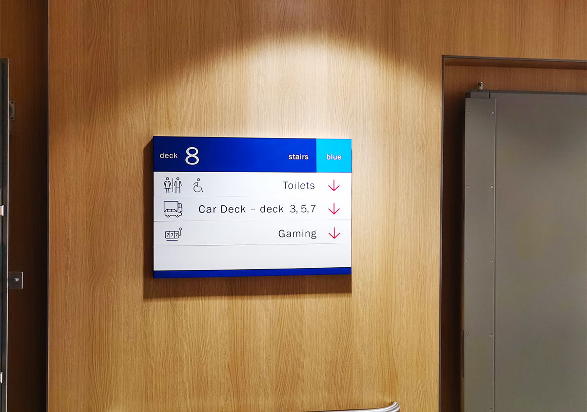DFDS 船长214米,宽27.8米,3090米车道,可载乘客890人,船员110人。设计吃水6.4米,1C冰级符号,入级DNV-GL船级社,双机双桨,配置3台侧推,大大提高了船舶的可操作性,以及靠离港工作效率。我司承接船上指示标识(包含吊式指示标识、舱室门牌、墙面指示标识、数字指示标识、梯道标识、Car Deck标识等)、商业标识(不锈钢字、3M玻璃膜、装饰画、不锈钢印刷)的设计、制作与安装工作。