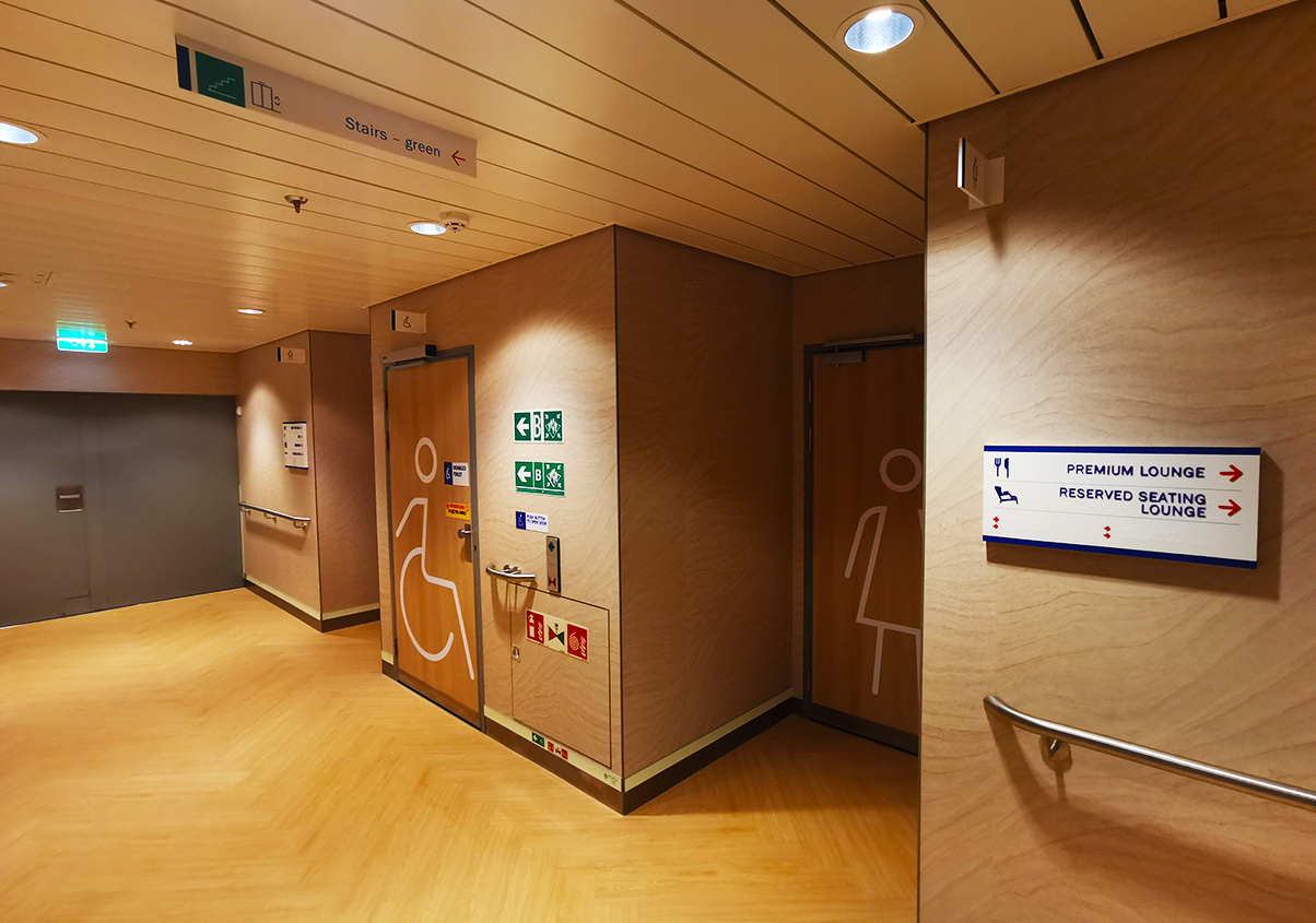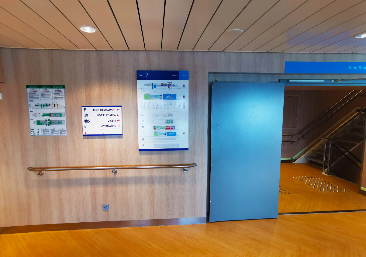 Brittany Ferries, operated by a French shipping company, is a natural gas (LNG) powered vessel with a length of 214.5 m, a width of 27.8 m, a design draft of 6.4 m, a lane length of 2,716 m and a speed of 23 knots. The vessel meets the ice class 1C requirements and the latest international standards for safe Return to Port (SRtP). Classification society DNV-GL.We accept the ship indicator (including hanging type indicator, the cabin door, metope indicator, digital indicator, staircases marks, Car Deck, etc.), business logo (stainless steel word, 3 m glass membrane, adornment, stainless steel printing), braille identification (braille indicator, security identity, etc.) the design, production and installation work.