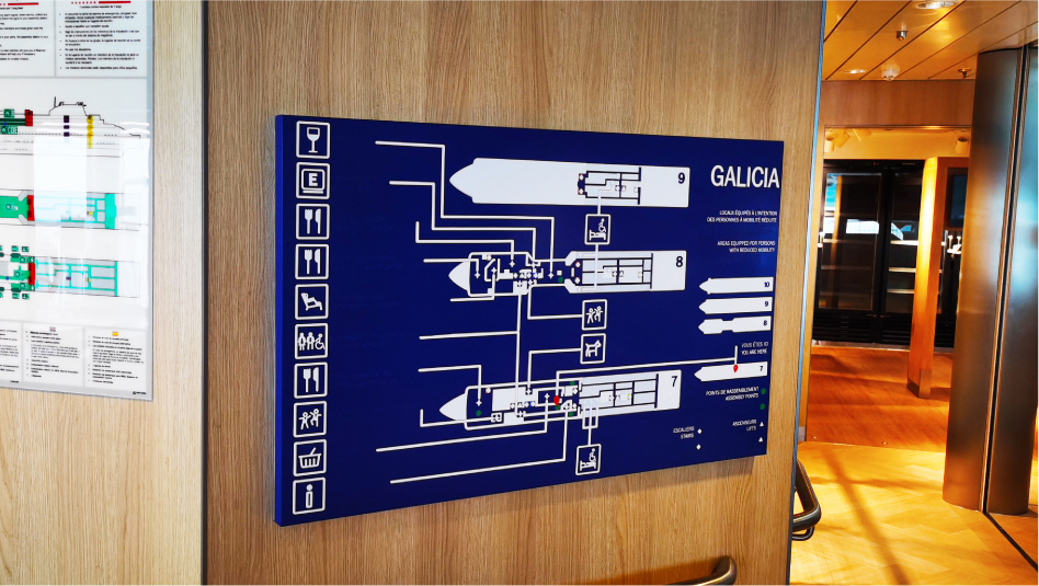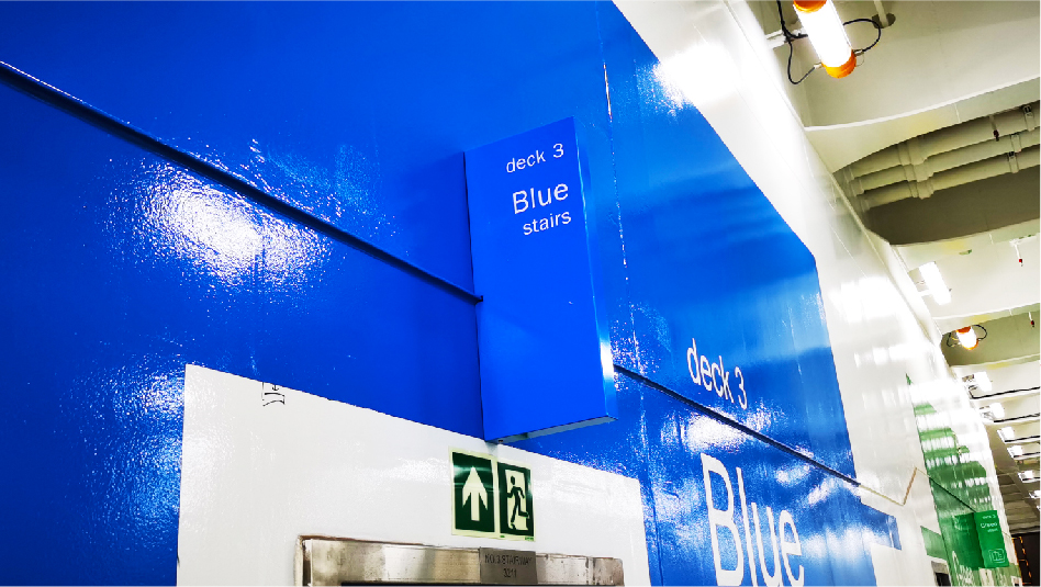 客滚船公区是非常重要的交流空间,也是客流量最大的区域,其导视标识设计符合人机学原理,便于观察、易于理解、方便引导。
